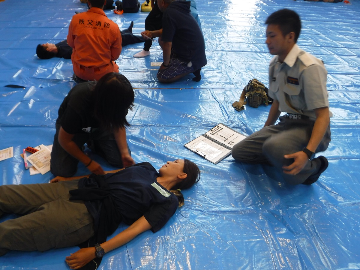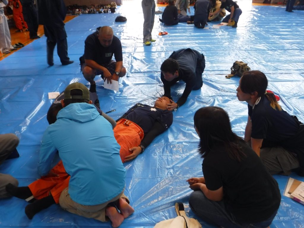 班に分かれて、頚椎の保護や気道確保の方法、止血や異物の固定などのスキルはもちろん、フラットリフトやログロールという、傷病者を少し移動させるときなどに使う方法など、様々なスキルを身につけました。