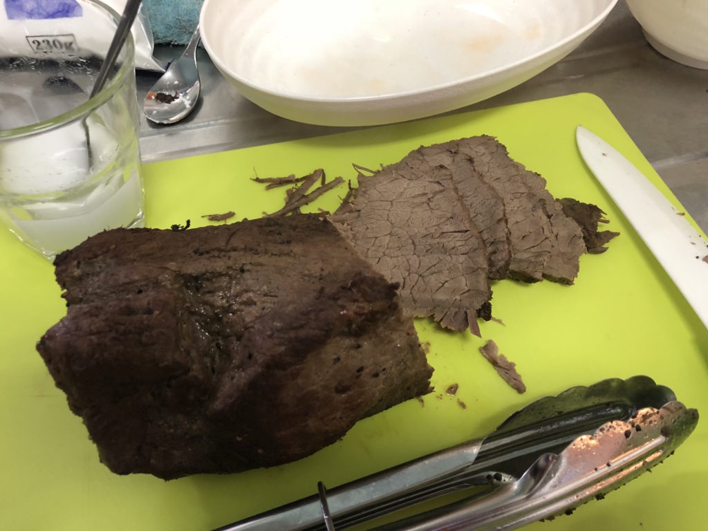 辛すぎる失敗でしたが、「まあ失敗もあるっしょ。ドンマイドンマイ!」てな感じで、パサパサのチャーシュー、じゃなくてローストビーフを食べました。500gほどのブロック肉だったので、かなりの量でした。食べきれない分は翌日、インスタントラーメンに入れました。