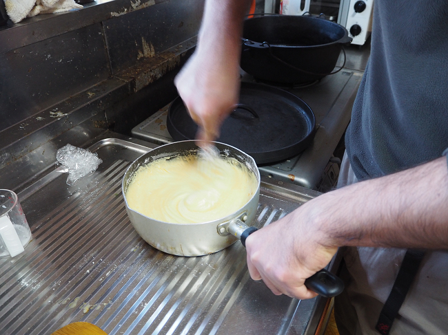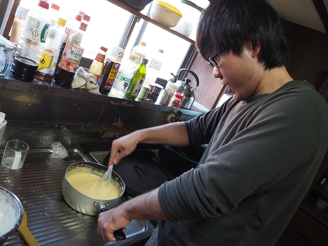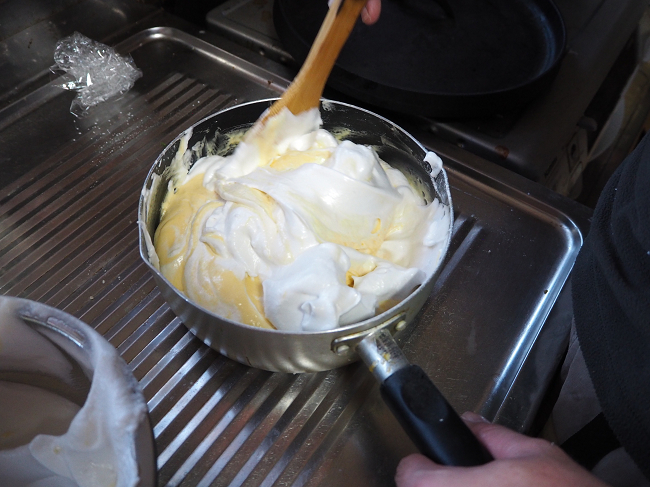 ケーキ作りの段階としては、メレンゲ作り→たまご生地つくり→融合→ダッチでちょろっと焼く、です。