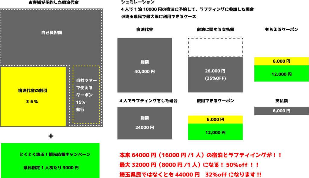 一人1万円の宿泊プランに予約すると35%引きで宿泊できてさらにラフティングで使える1,500円分のクーポンがついてきます。そこに埼玉県民限定とくとくクーポンを組み合わせれば4500円。ラフティングがおおよそ6,000円なのでなんと1500円で参加できる計算になります。県民ではなくても4500円。
