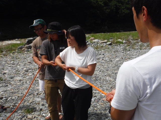 2日目午前・陸上 ロープを使った倍力システムの構築、午後・河川 個人技能練習(流水泳法・ロープバック救助など)