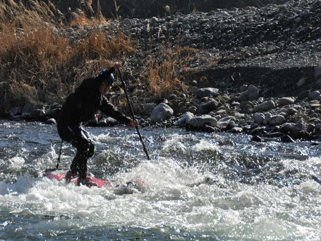 また、今日のトレーニングではラフティングボートのほかにリバーSUPでも川を下りました。