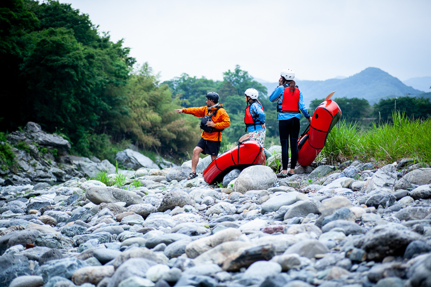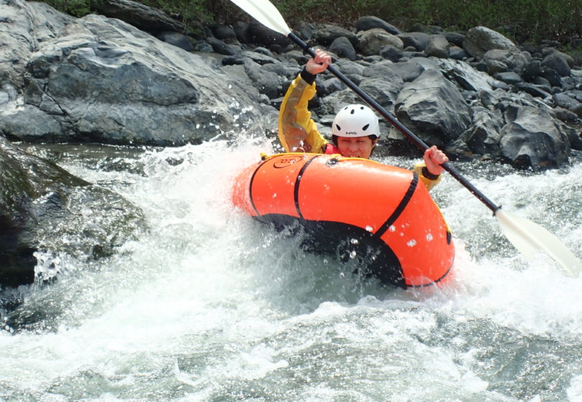 午前中はまず初めての方向けの基礎的なレクチャーを行います。(パックラフトの取扱やパドリング方法)ボートに慣れてきたら流水の特性を体感・練習、急流域でのセルフレスキュー(自己防衛)方法を練習します。