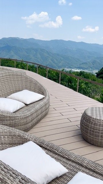 おしゃれなテラスで景色と共に楽しめるドリンクなどは「山頂レストハウス」でテイクアウト(水曜定休)👍