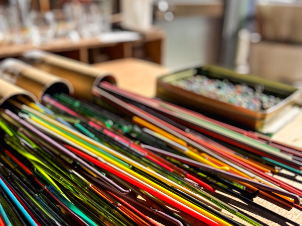 工房の扉を開けると、色鮮やかなガラス作品がずらりと並び、思わず子どもたちが目を輝かせる空間が広がります。
