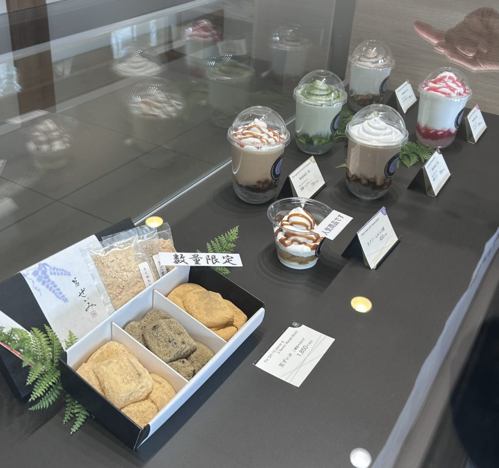 箱にぎっしりと並んだ大きなわらび餅に、色鮮やかな「わらび餅ドリンク」がずら〜り。